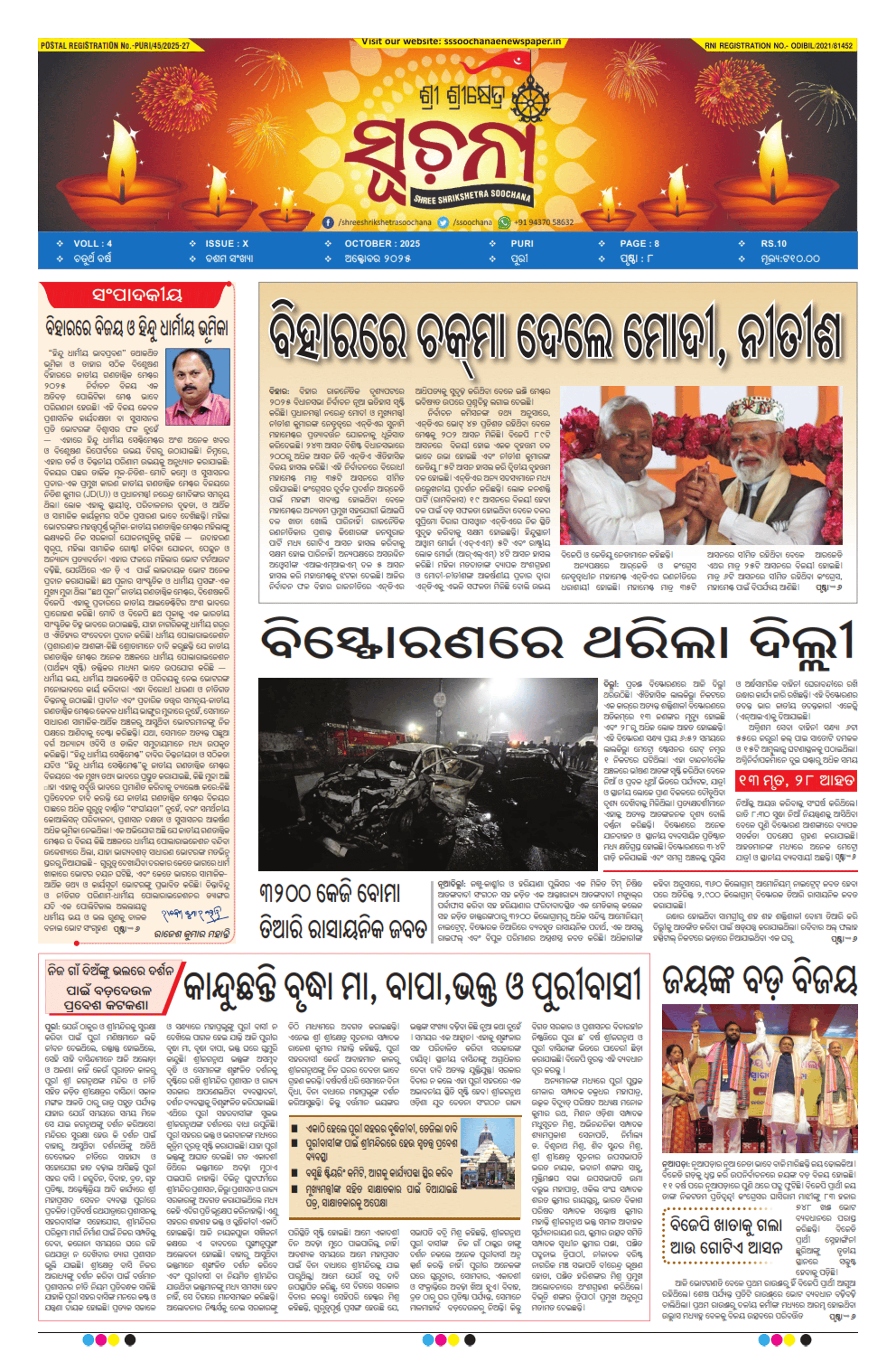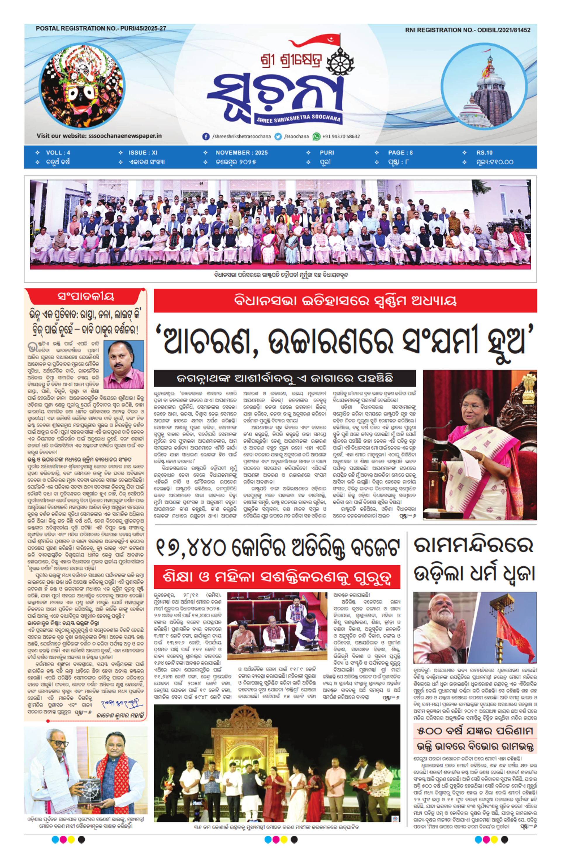 Shree Shrikhestra Soochana is a bilingual English and Odia monthly news bulletin that aims to promote the "Shri Jagannath Culture" on a larger scale. It covers various topics related to the culture of Lord Jagannath and the cultural heritage of Puri, as well as other important special events that are beneficial for society. Esteemed scholars contribute articles to this bulletin, adding valuable insights and knowledge. With its wide circulation across India, Shree Shrikhestra Soochana plays a significant role in spreading awareness about the rich cultural traditions associated with Lord Jagannath and Puri.